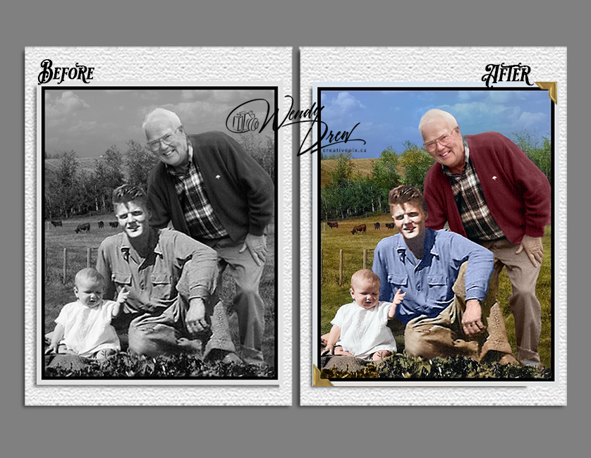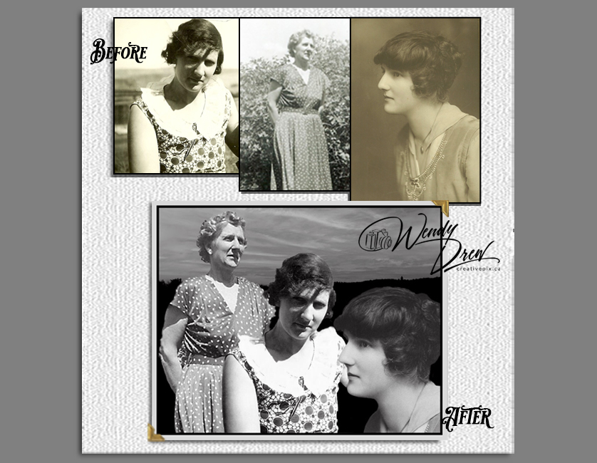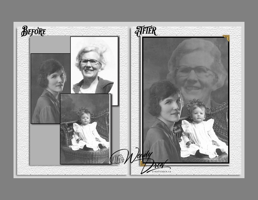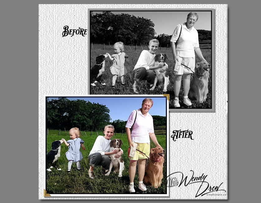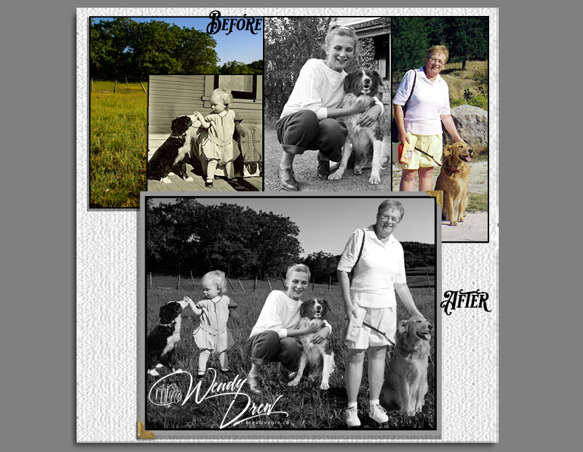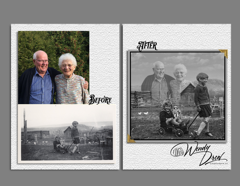 When doing Compositiions, the subjects are extracted from the original background and then placed on a new background. Sometimes the original background can be used. Because the pictures are quite often from different times, they need to be converted to black and white to keep the Composition smooth and clean looking. Adding color can be done later, and may look quite sharp, as in the examples below.